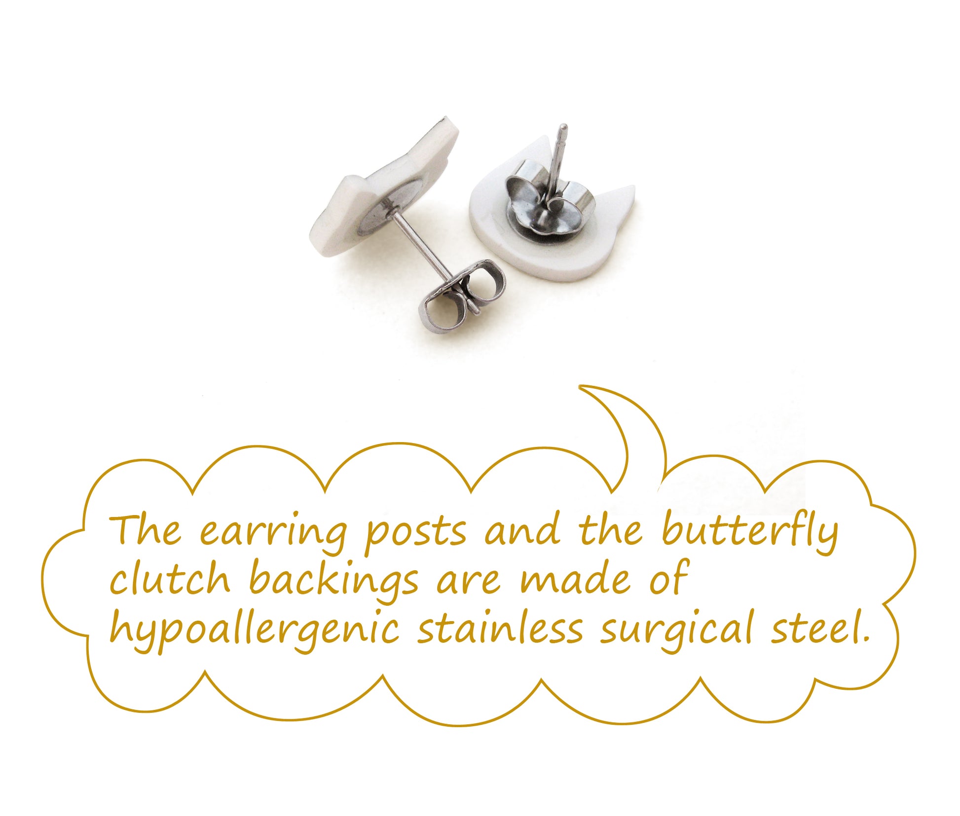 “No worries for sensitive ears.” The earring posts and the butterfly clutch backings are made of either stainless steel (hypoallergenic) or titanium (super hypoallergenic).